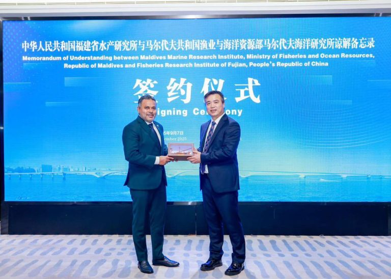 Minister @Shiyamaldives witnessed the signing of Memorandum of Understanding between the Maldives Marine Research Institute and the Fujian Fisheries Research Institute of the People’s Republic of China.