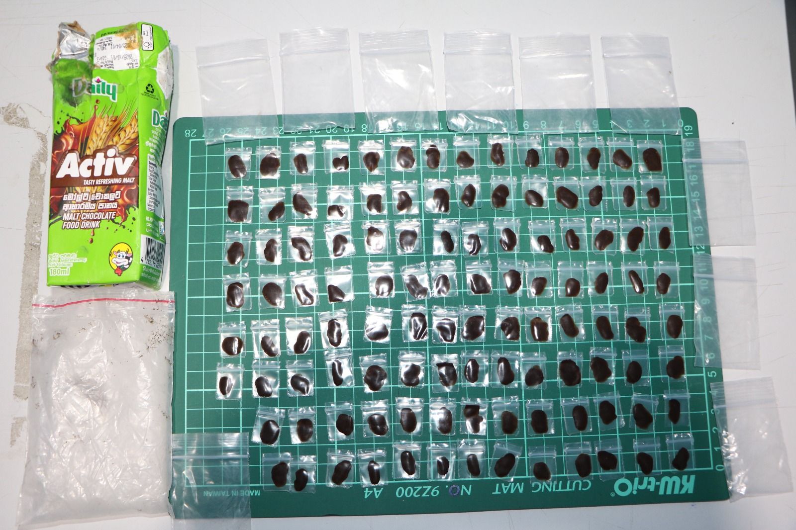 އެދެމީހުން ހައްޔަރުކޮށް، އެމީހުންގެ ހަށިގަނޑާއި އެމީހުން އެވަގުތު ތިބިތަން ބަލައިފާސްކުރިއިރު، މަސްތުވާތަކެތިކަމަށް ޝައްކުކުރެވޭ އެއްޗެއްހުރި 110 ރަބަރު ޕެކެޓް ފެނިފައިވެއެވެ. މިތަކެތީގެ ވަގުތީ ބަރުދަނަކީ 10.6 ގްރާމެވެ.