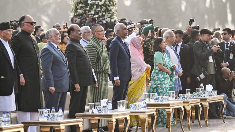 ރައީސުލްޖުމްހޫރިއްޔާ ޑޮކްޓަރ މުޙައްމަދު މުޢިއްޒު، ބަންގްލަދޭޝްގެ ބޮޑުވަޒީރުކަމަށް އަލަށް އިންތިޚާބުވެވަޑައިގެންނެވި ހިޒް އެކްސެލެންސީ ތާރިޤް ރަޙްމާން މަޤާމުގެ ހުވާކުރެއްވުމާއި އައު ސަރުކާރު ހުވާކުރެއްވުމަށް ބޭއްވެވި ރަސްމިއްޔާތުގައި ބައިވެރިވެވަޑައިގެންފިއެވެ. މިއަދު މެންދުރުފަހު މި ރަސްމިއްޔާތު އޮތީ ޑާކާގެ ނޭޝަނަލް ޕާރލިމަންޓްގައެވެ.